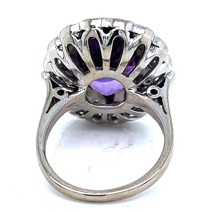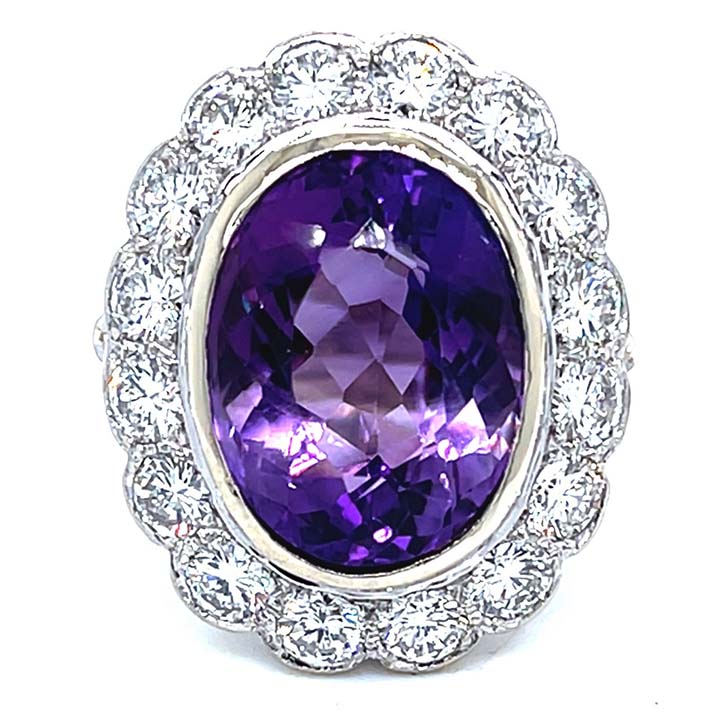 18 kt white gold Amethyst and diamond cluster ring; featuring an oval faceted bezel set Amethyst surrounded by a halo of 16 matching round brilliant cut diamonds bead set with a swaged edge. Supported on a pierced petal motif under gallery. The chennier shoulders are pinched bright polished and transition down to a rounded 2.2 mm shank.