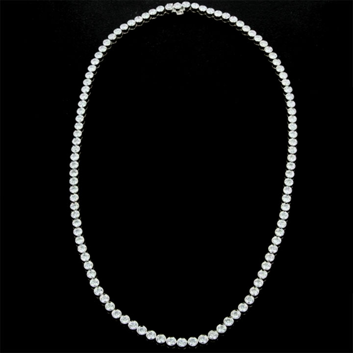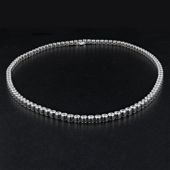 Custom designed 18kt white gold bezel set diamond necklace; featuring 106 matching round brilliant cut diamonds individually set in bezel style mountings with polished galleries linked together and guaranteed not to twist.