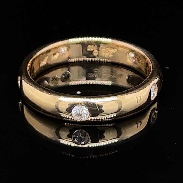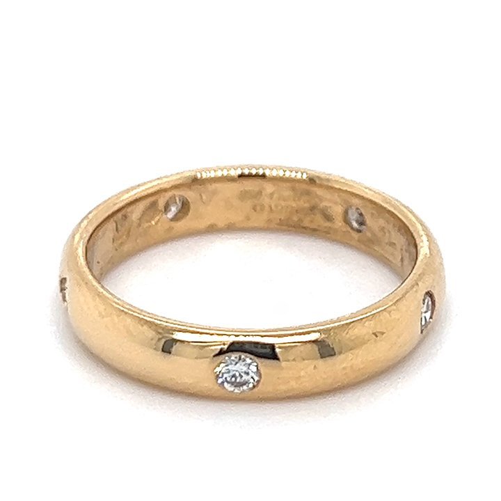 Cartier 1895 18 kt yellow gold flush set diamond band; featuring a classic bright polished “D” section band flush set with 5 matching round brilliant cut diamonds
