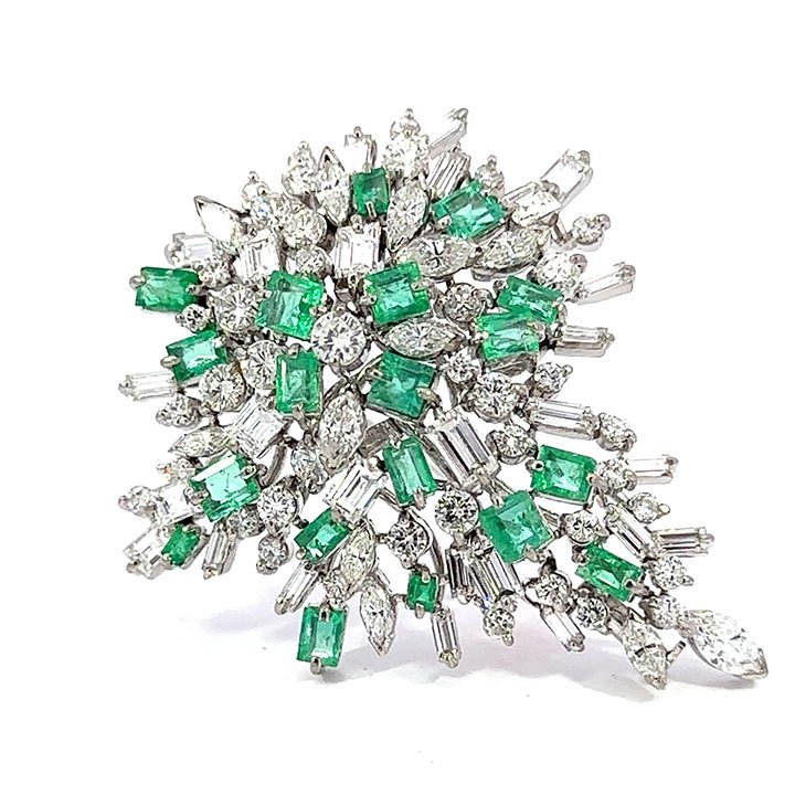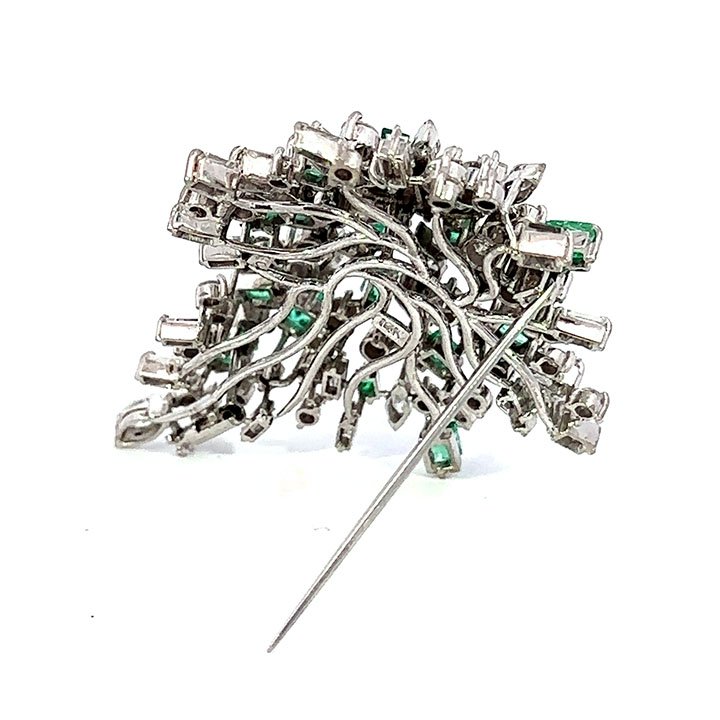 White gold emerald and diamond spray pin; featuring a vibrant pear shaped dome of straight baguette cut cut emeralds, accented with round brilliant, marquise and baguette cut diamonds. Fitted a pin and plunger style safety clasp.