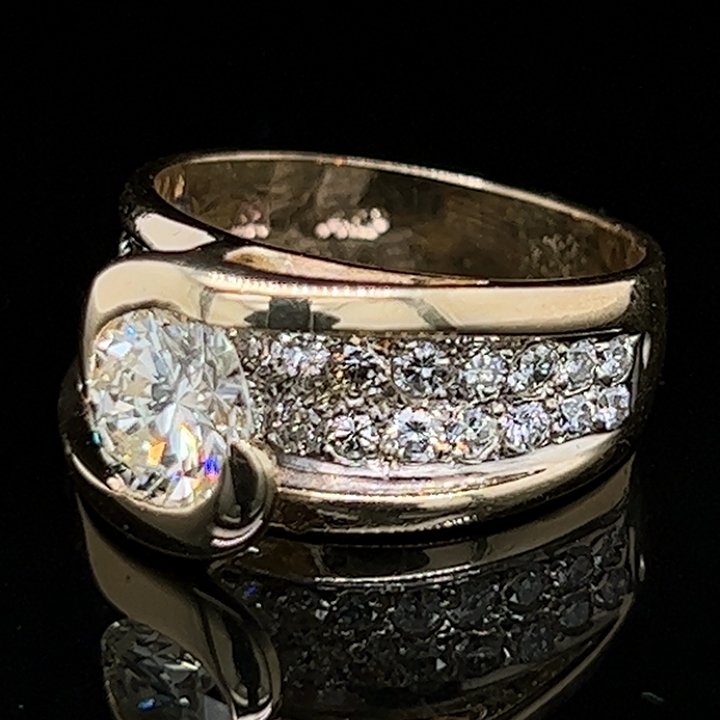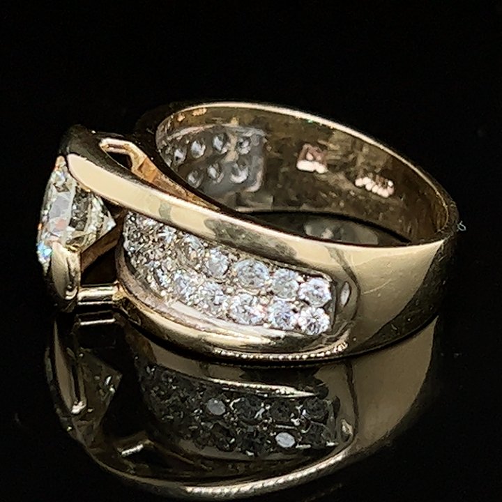 Yellow and white gold floating diamond solitaire ring; featuring a partially bezel set floating round brilliant cut diamond floating above a white gold section of 30 round brilliant cut diamonds pave set in white gold that are set all the way to the shoulders. Transitioning down to a bright polished 4.46 mm shank.