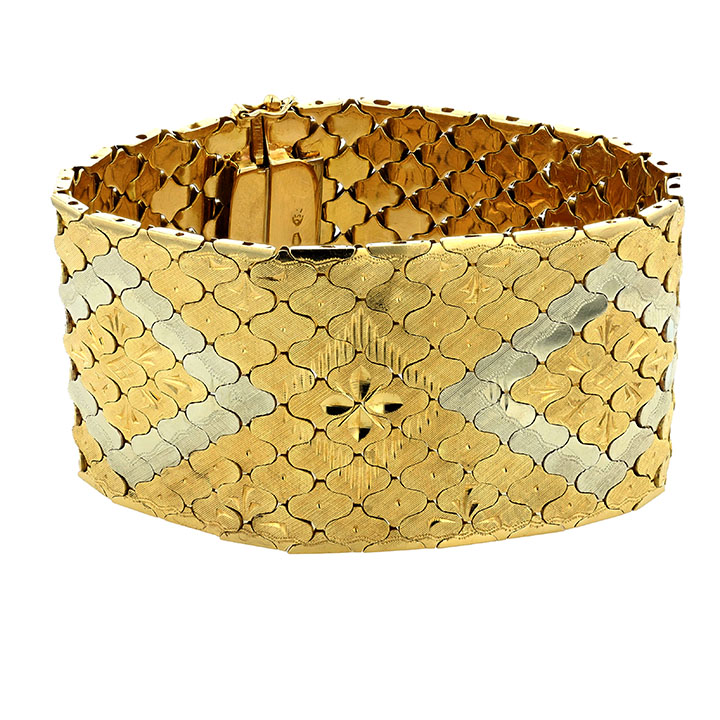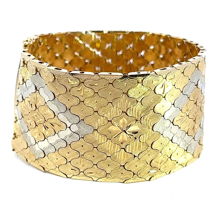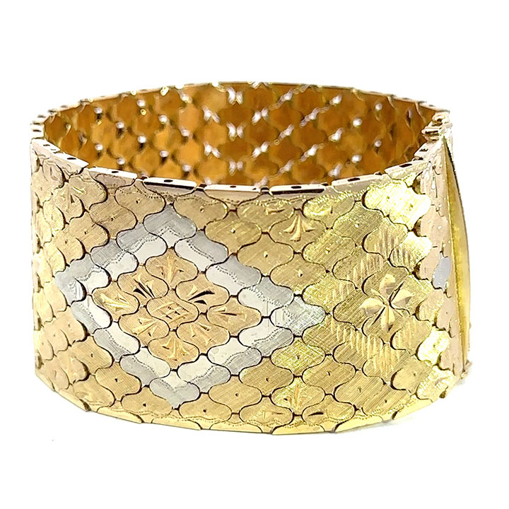 18 kt two color Italian gold wide flexible bracelet; featuring 3 white gold triangles with bright cut foliate motif panels and accents on a Florentine finished back ground. Fastened with a hidden box snap fastener and two figure of eight safety clips.