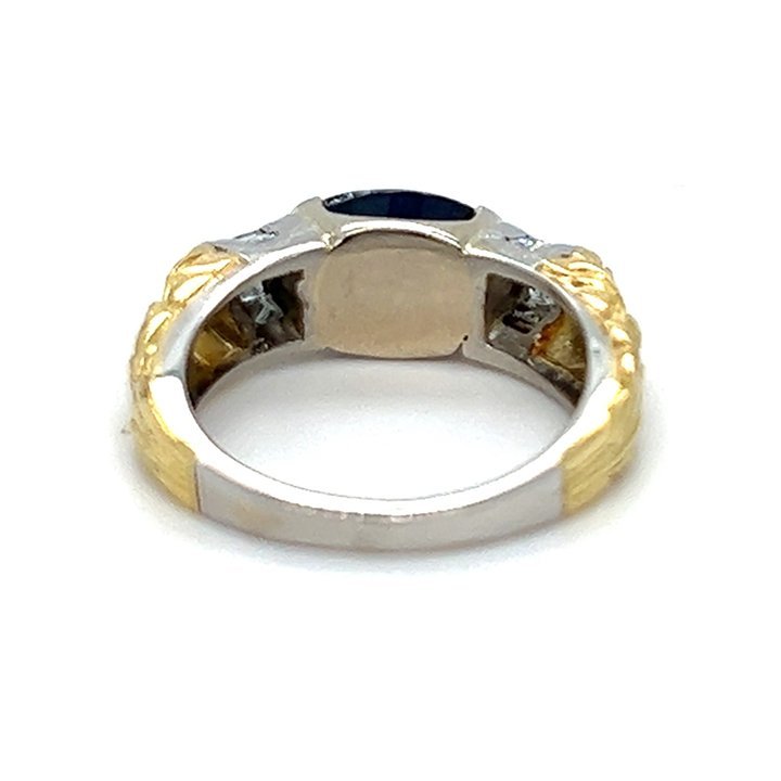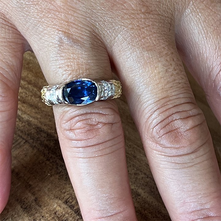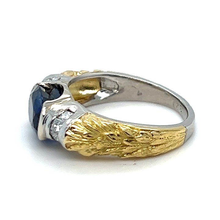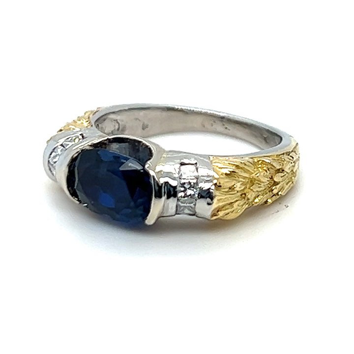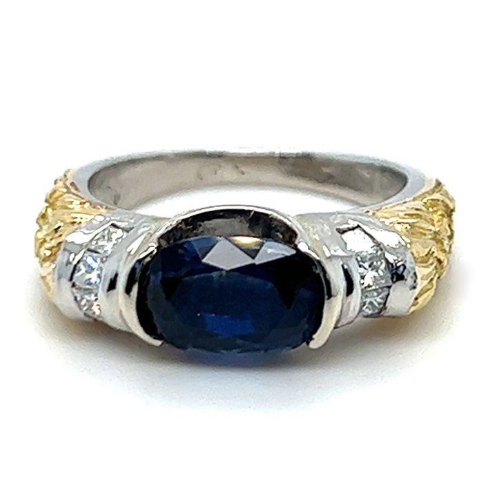 Platinum and gold sapphire and diamond solitaire ring; featuring a landscape oriented bezel set, natural oval faceted blue sapphire. Flanked by a roll of channel set with 4 princess cut diamonds on each side (8 total). With hand carved acanthus leaf motif shoulders, transitioning down to a polished platinum shank.