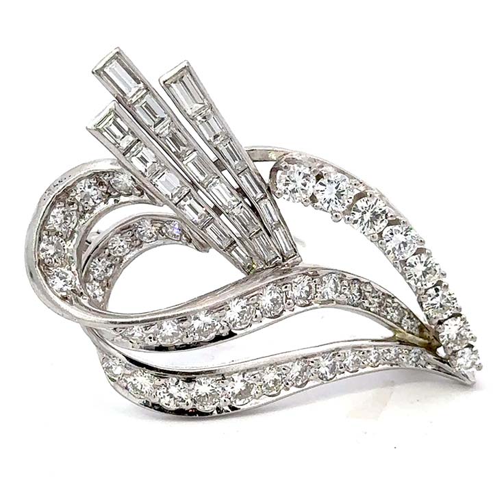 Platinum diamond mid century period spray pin; featuring bead set round brilliant cut diamonds in a leaf motif further accented with 3 intersecting rows of straight baguette cut diamonds in a leaf motif. Fitted with a pin and safety clasp.
