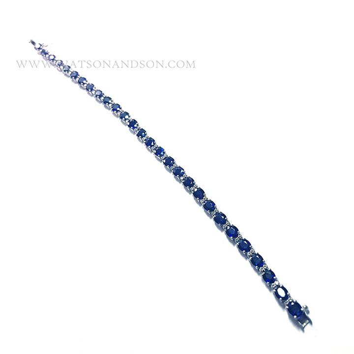 18 kt white gold sapphire and diamond straight line bracelet; featuring 28 oval faceted blue natural sapphires supported in 4- prong double gallery mountings, inter spaced with 2 round brilliant cut diamonds (56 total). Fastened with a concealed box snap and figure of eight safety clip.
