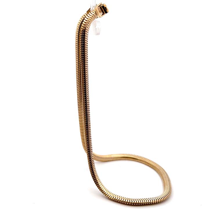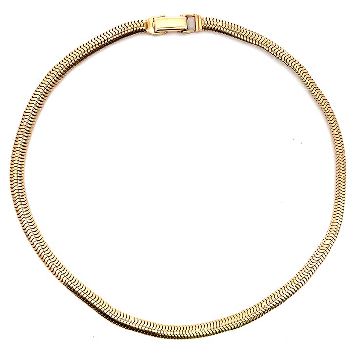 14 kt yellow gold snake necklace; featuring a bright polished slinky snake link choker, fastened with a folding ladder clasp.