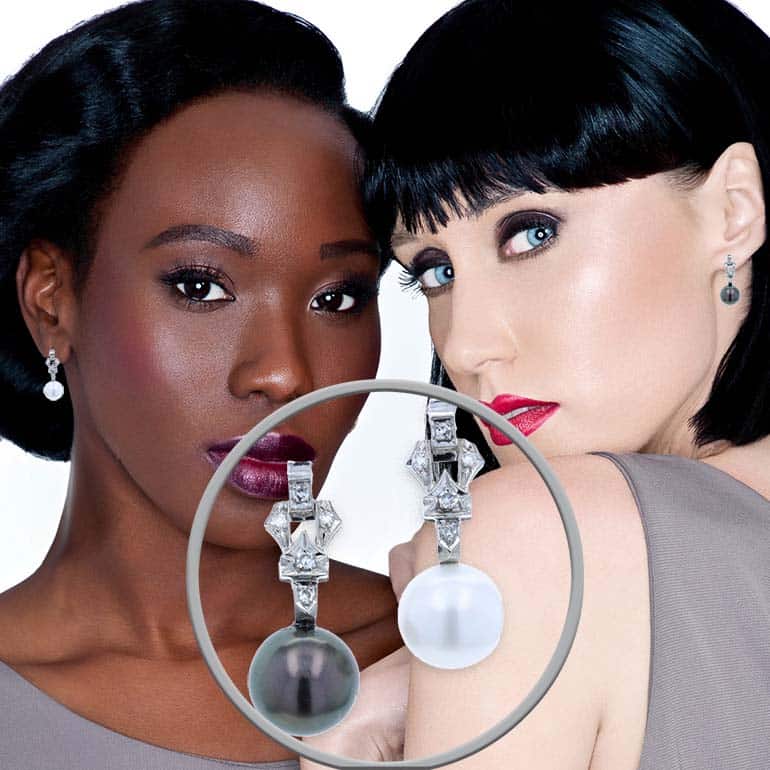 Articulated platinum dangles are bead set with ten sparkling single-cut diamonds framed in milgrained edges, dropping to a perfectly mismatched-yet-matched duo of round pearls: one peacock-hued Tahitian, one glowing South Sea white. At a refined 1″ drop, they’re bold enough for evening, but chic enough to wear with a white shirt and great lipstick.