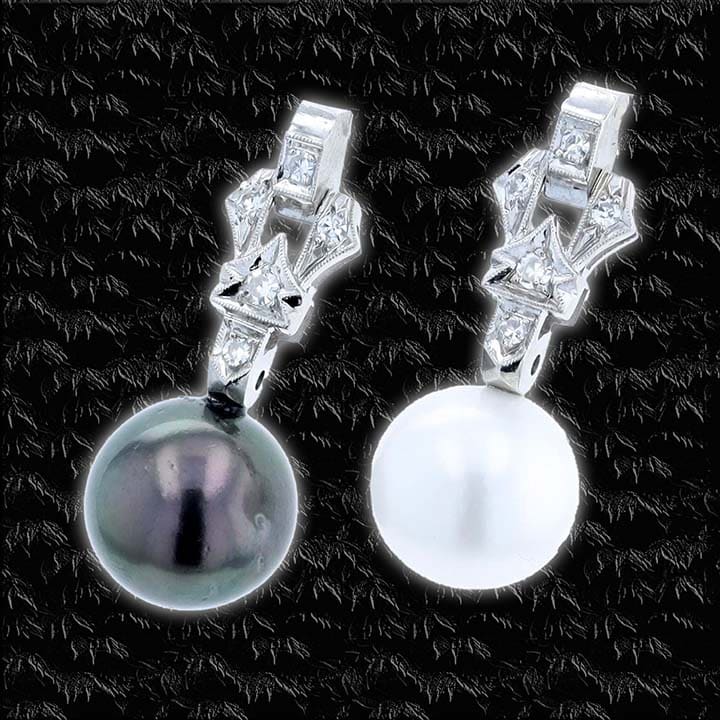 Style: Platinum Tahitian black & South Sea white pearl diamond drop earrings