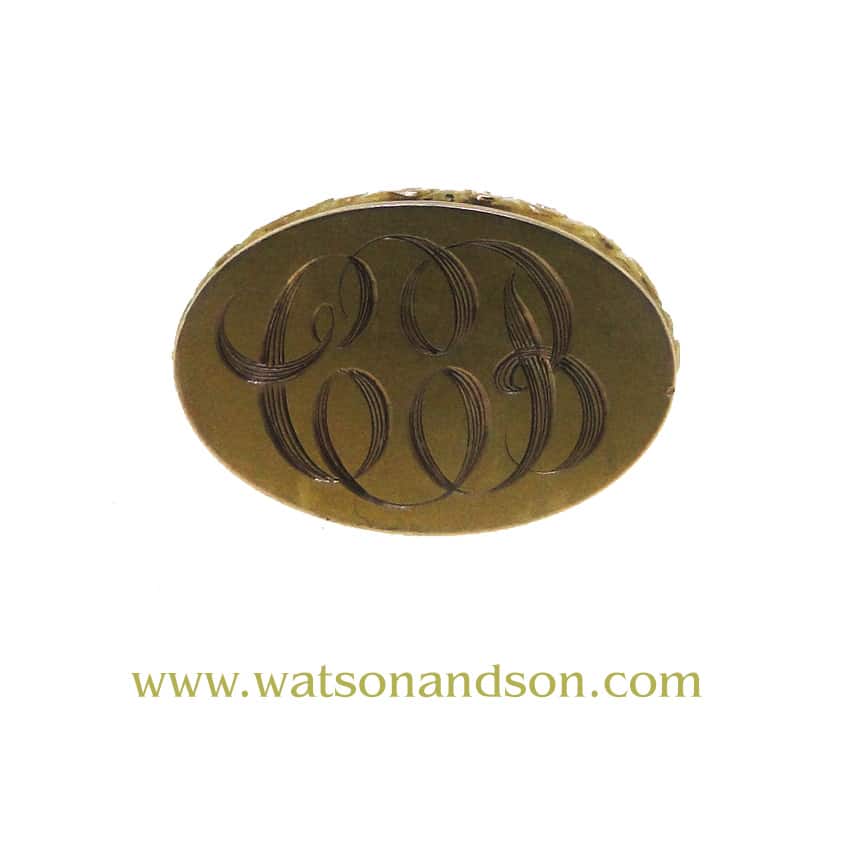 The design features an oval base framed by an engraved foliate border, topped with a graceful bail that releases six curved, fluted gold bars—each finished at the base with tiny granulated spheres for that delicious Victorian texture and depth. It’s also monogrammed “CCB,” making it feel like a tiny heirloom time capsule: someone’s initials, someone’s correspondence, someone’s story.