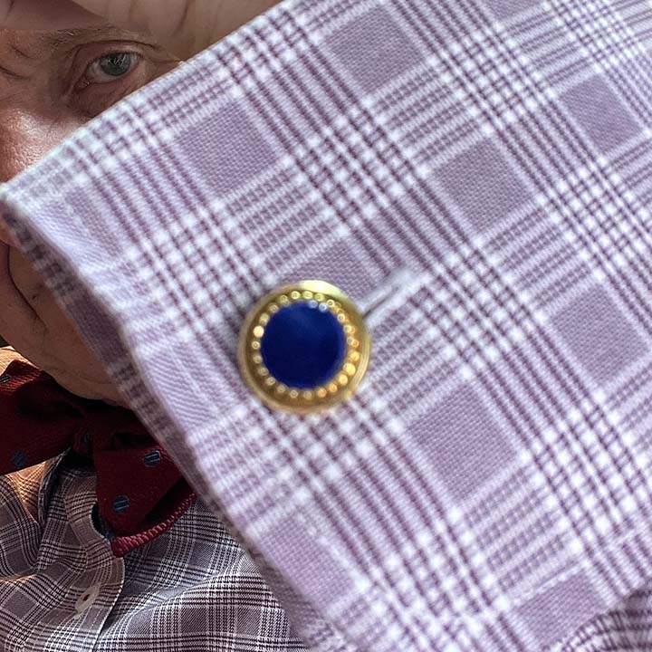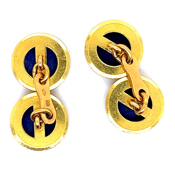 18k yellow gold, double sided, cuff links featuring a smooth, circular cut, smooth piece of lapis in the center, secured by a multi prong bezel set setting.